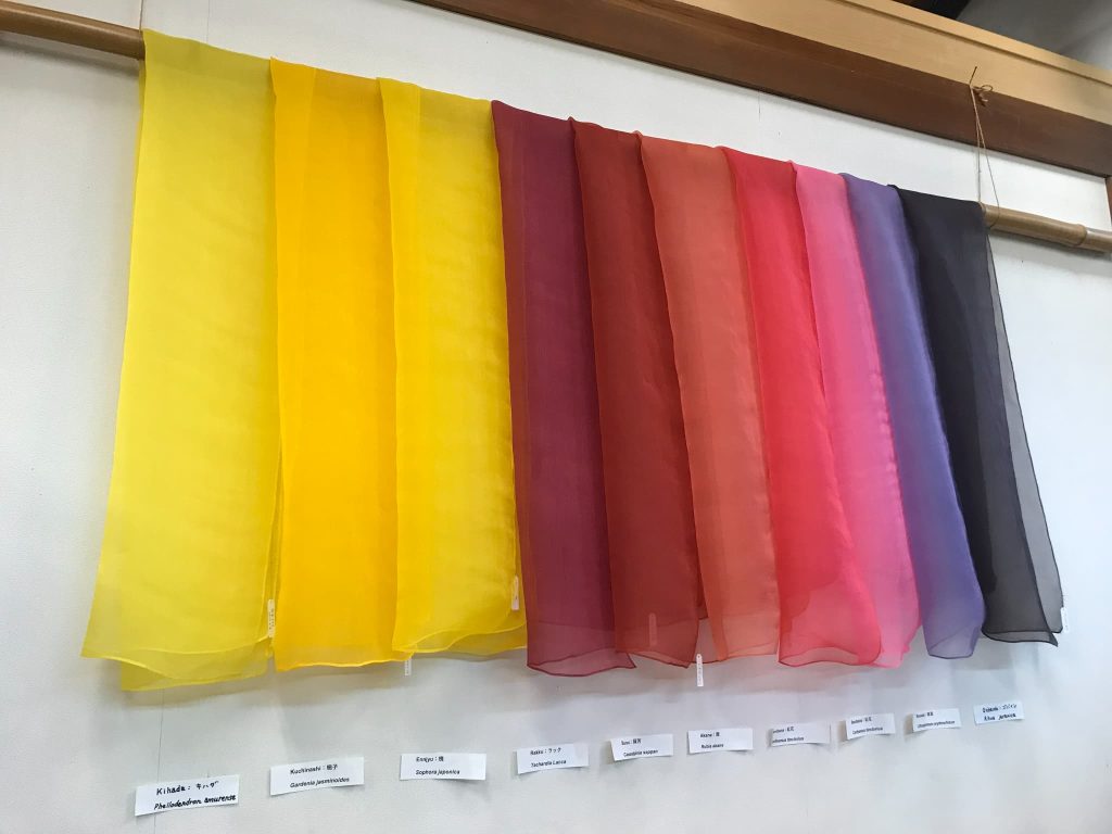 講義ではその日に使う染料植物の解説や染色の歴史、実際の作品や布の色見本を用いた説明を行います。また、応用クラスで行う型染や木綿染、重ね染の染色見本や実際の作品も観ていただいています。